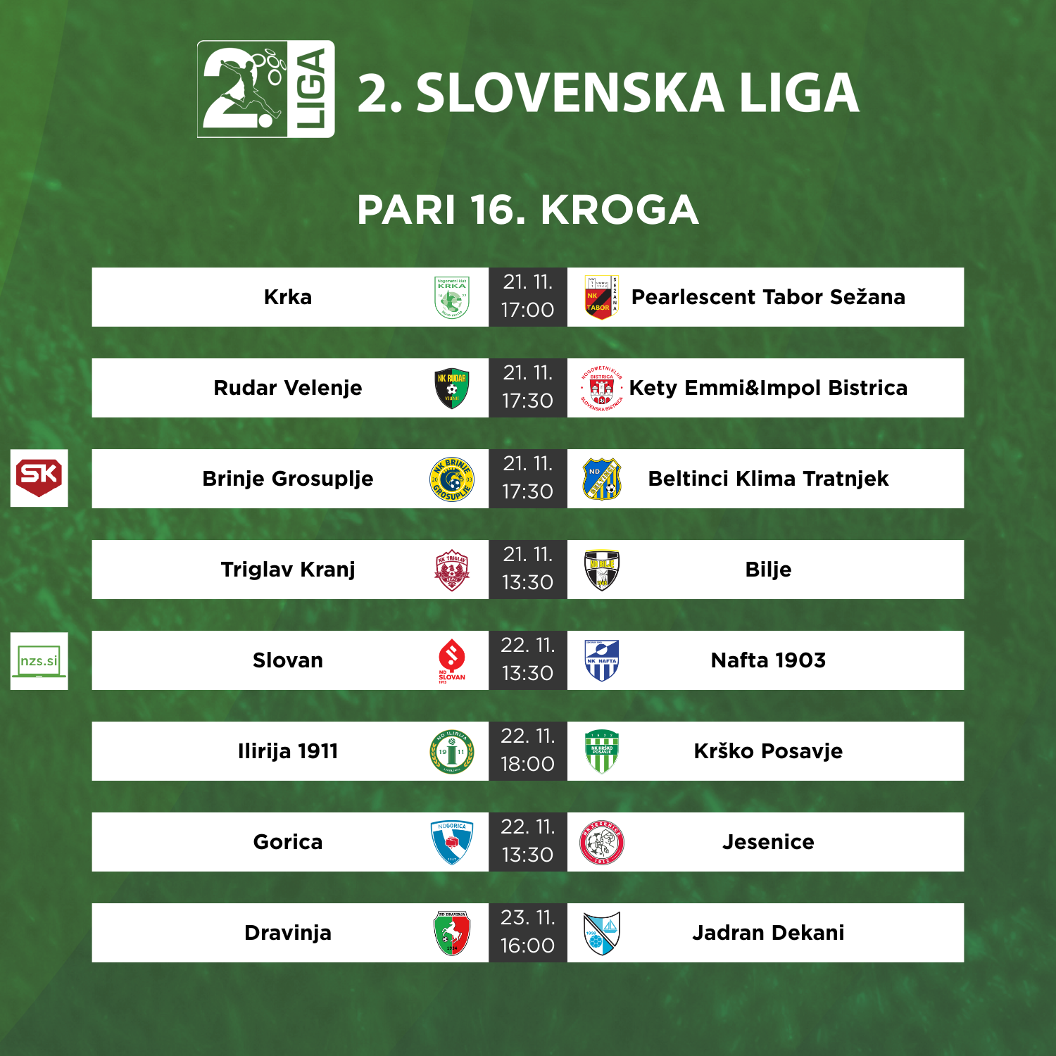 Drugoligaši bodo jesenski del sezone zaključili s tekmami 16. kroga. Nafta 1903 bo prvo mesto branila na gostovanju pri Slovanu, dvoboj s Kodeljevega pa bo pospremila tudi kamera NZS. V derbiju kroga se bosta pred kamerami Sportkluba udarila drugo Brinje in tretji Beltinci.