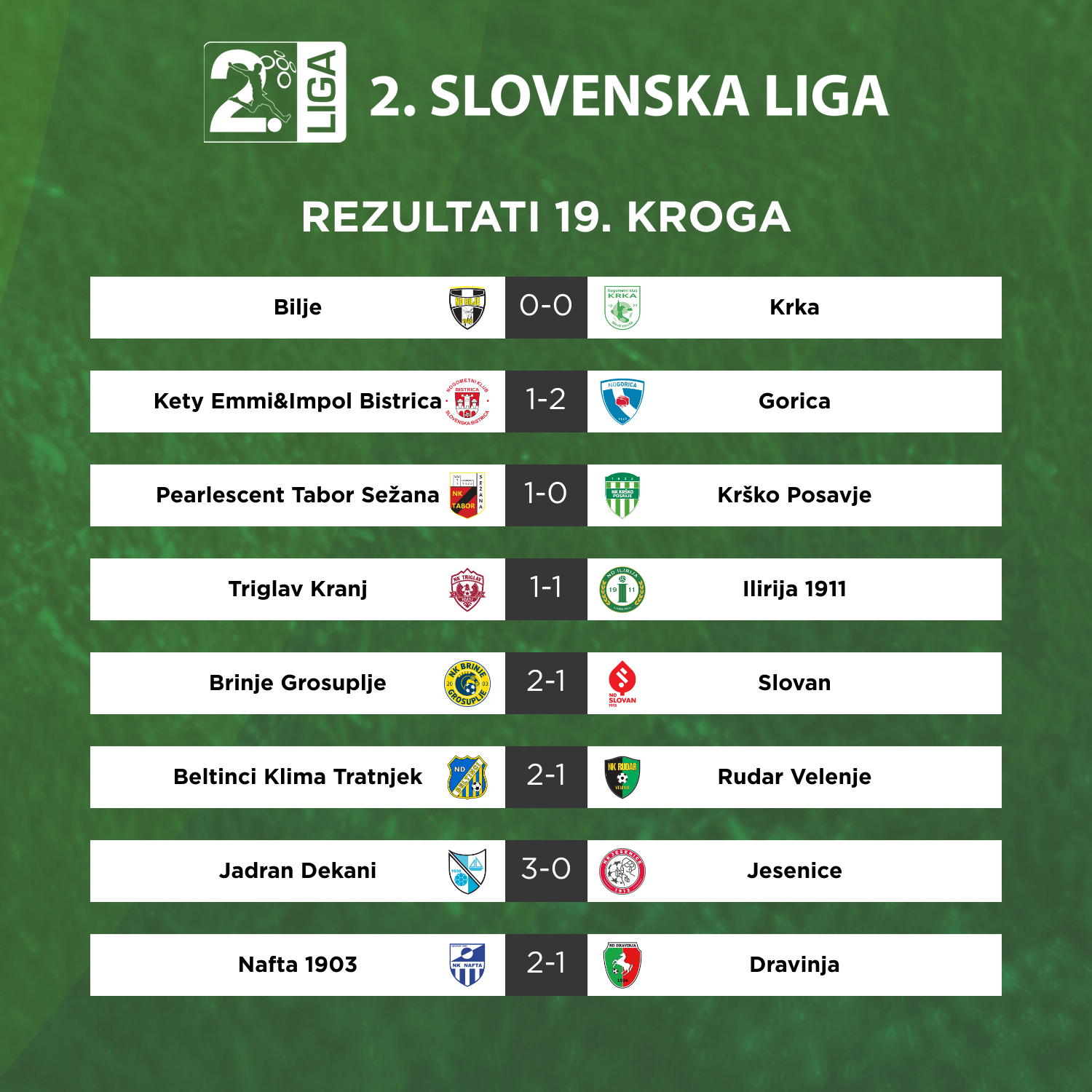Brinje so se po visokem porazu v Kranju - Grosupeljčani so na Gorenjskem izgubili prvič v aktualni sezoni - pobrali z zmago v dvoboju proti Slovanu. Ljubljančani so se v zaostanku znašli po devetih minutah igre, ko je v polno meril Jan Kovač. Mreža Slovana se je sredi prvega polčasa zatresla še drugič, domačo prednost je podvojil Samo Matjaž. Gostje iz prestolnice so tri minute pred odmorom prepolovili zaostanek, a gol Benjamina Adrovića ni zadoščal za preobrat Ljubljančanov, ki so doživeli drugi zaporedni poraz, skupno desetega v sezoni. Izenačenje Ljubljančanov je tri minute pred koncem tekme preprečil domači vratar Tim Štrasberger, ki je zaustavil enajstmetrovko Lana Jeraka. Slovan je z 21 točkami ostal na osmem mestu lestvice, Brinje so vsaj do ponedeljka prevzele vrh lestvice.