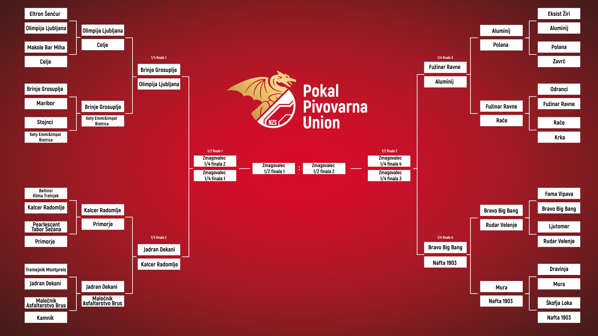 S sredinima tekmama v Dekanih in Grosupljem se pričenja četrtfinalni spored Pokala Pivovarna Union. Radomljani bodo gostovali pri Dekančanih, Olimpija pa se bo v Grosupljem pomerila z Brinjem, ki je jeseni izločilo že ekipo Maribora.