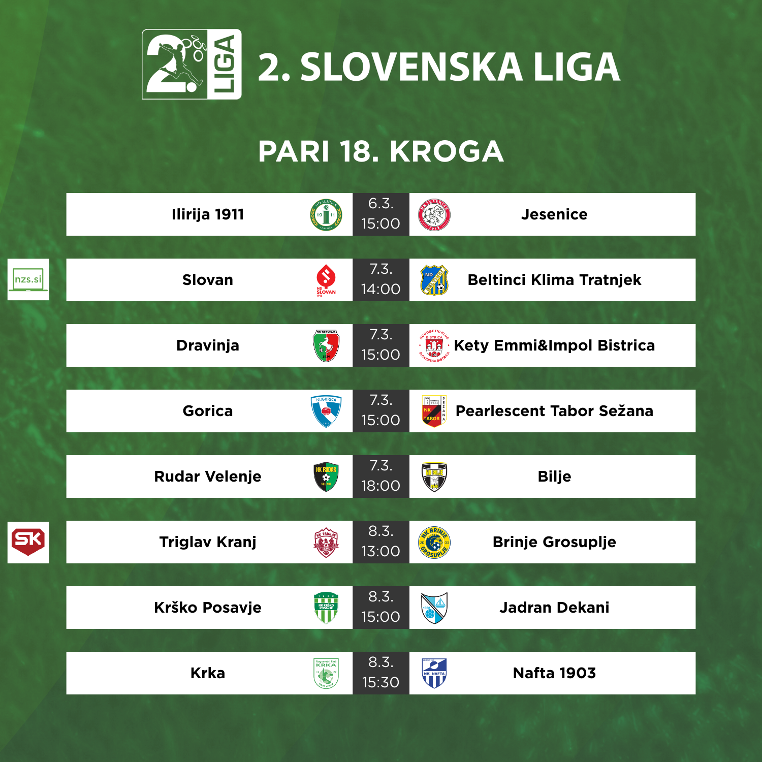 V petkovem popoldnevu bodo 18. krog drugoligaškega tekmovanja odprli nogometaši Ilirije 1911 in Jesenic. V nogometno pomlad so bolje vstopili Gorenjci, ki so v Velesovem z golom zimskega novinca Borne Panića dobili dvoboj s Krčani. Jeseničani so se s tretjo zmago - še drugič v sezoni so premagali Posavce - poslovili od cone izpada, nad nevarnim območjem pa bodo skušali ostati tudi po gostovanju v prestolnici. Ljubljančani so bili pri vročih Grosupeljčanih na robu presenečenja in odmevne zmage, a so po domačem preobratu v režiji Nikole Jovićevića, ki je zadel v 88. in 90. minuti, ostali tudi brez točke. Radovan Karanović je epizodo na ljubljanski klopi odprl s porazom, ki se mu bodo skušali zeleno-beli izogniti v petek. Jesenice so namreč z zmago na predzadnje mesto lestvice izrinile prav Ilirijo 1911, ki bo skušala ponoviti poletni scenarij in skočiti pred "železarje". Zasedba iz prestolnice je poleti na Jesenicah slavila z 0:3, kdo bo boljši v Šiški?